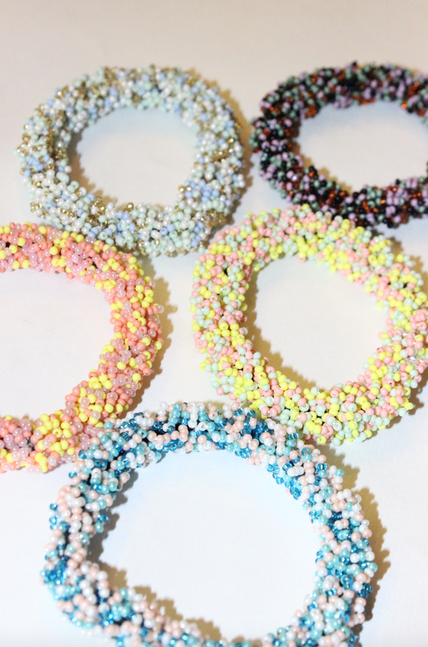 In our hand-sewn bracelet (Candycrush Bracelet, Flower Power Bracelet, Bubble Bracelet ect.) the glass beads and bracelets are made i India.