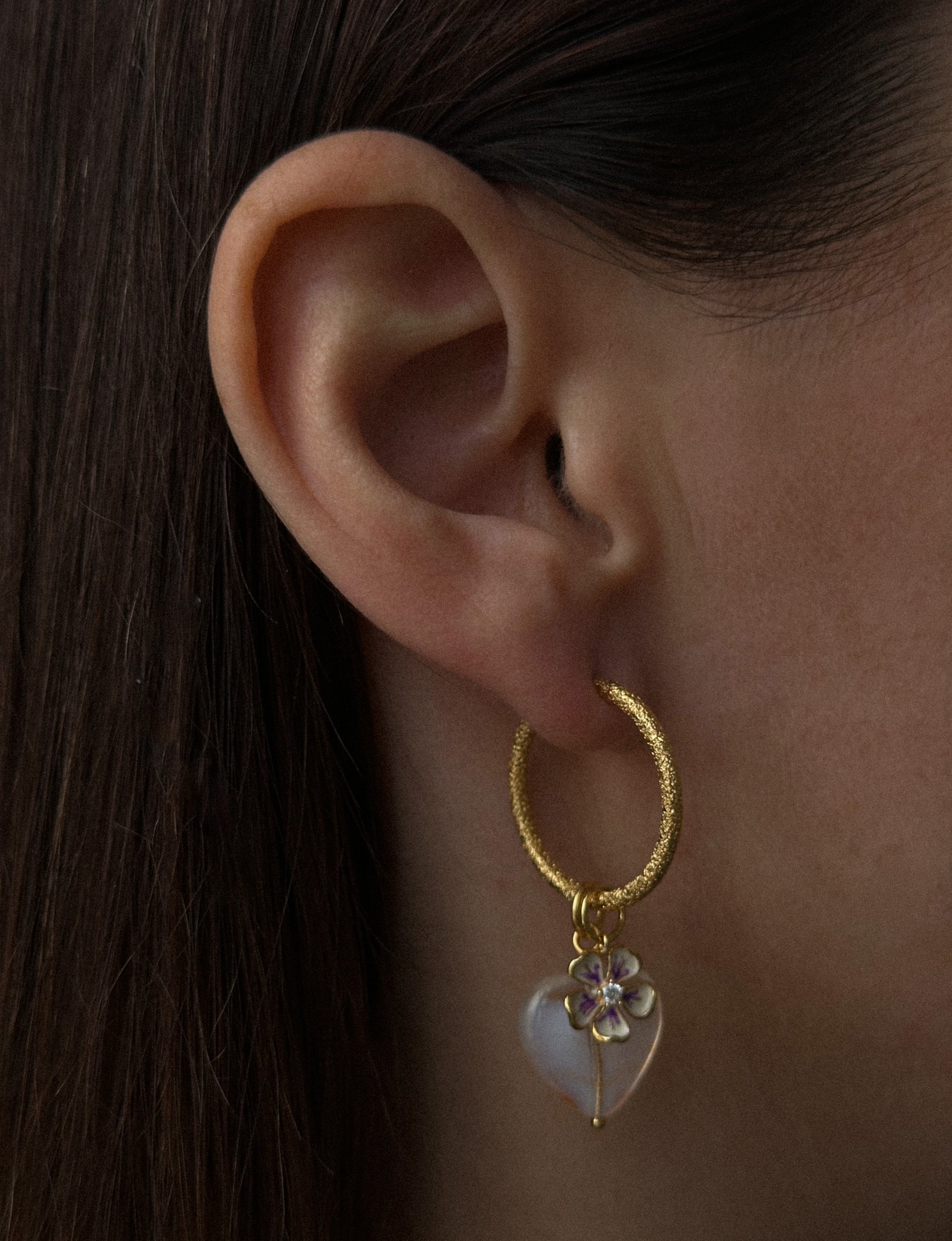 We use culture freshwater pearls, which are created and produced with the help of humans. Tissue or a plastic ball is inoculated into the freshwater mussel to irritate it. The mussel then tries to get rid of the irritation by isolating the mussel in a layer of mother of pearl and thereby forming the freshwater pearl. This process can take up to 2-3 years or longer. Used in Aubree Hoops, Aline Earring and Desiree Earring.