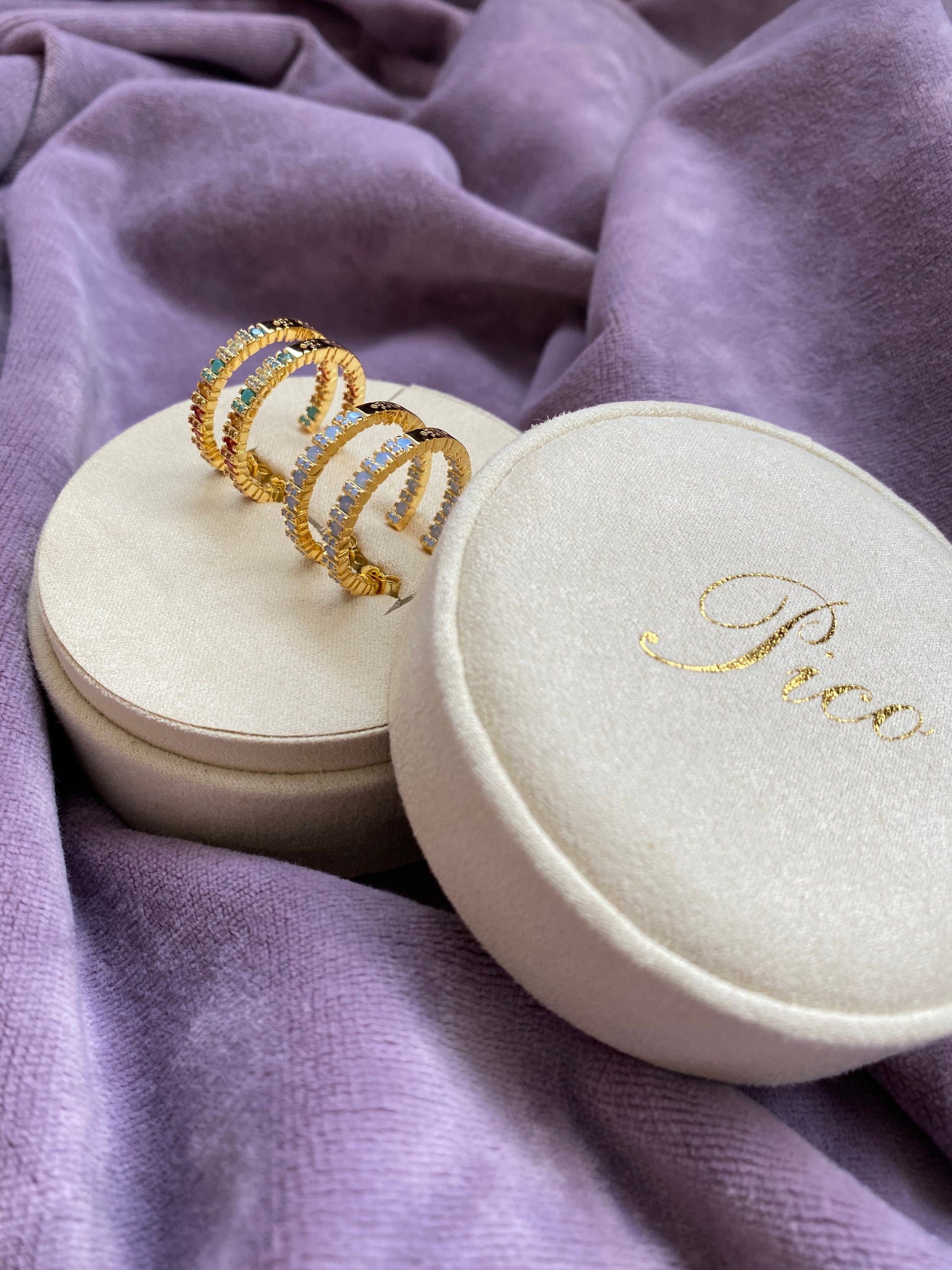 We work with Nanocrystals® in most of our jewelry. These crystals are man-made (made in a laboratody) and of very high quality. The advantage of these man-made crystals is the beautiful color palette. As used in our Rainy Hoops, Siri Hoops, Alphabet Stud and Pendants, Fruit Stud m.m. In some cases we also use Swarovski crystals, but due to the smaller color scale at Swarovski we prefer Nanocrystals®.