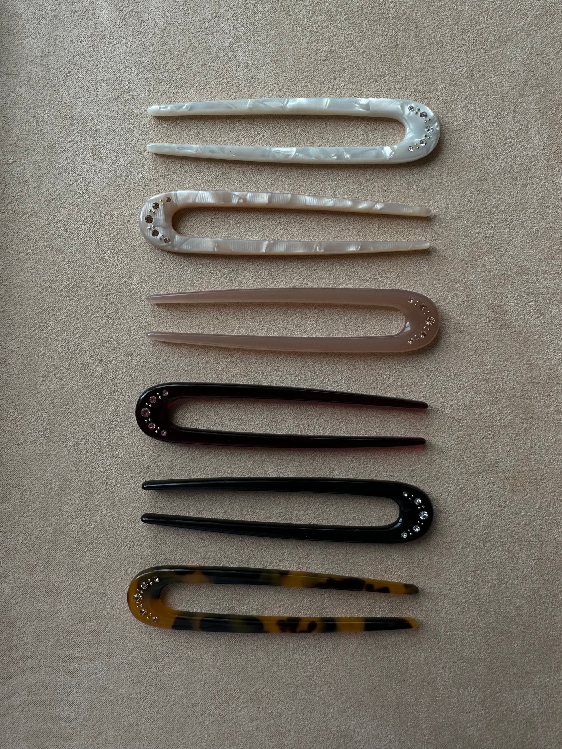 Made from high-quality acetate, this simple yet elegant hair accessory features five delicate crystals that catch the light beautifully. Perfect for both casual and special occasions, it’s an easy way to elevate your hairstyle with a subtle shine.