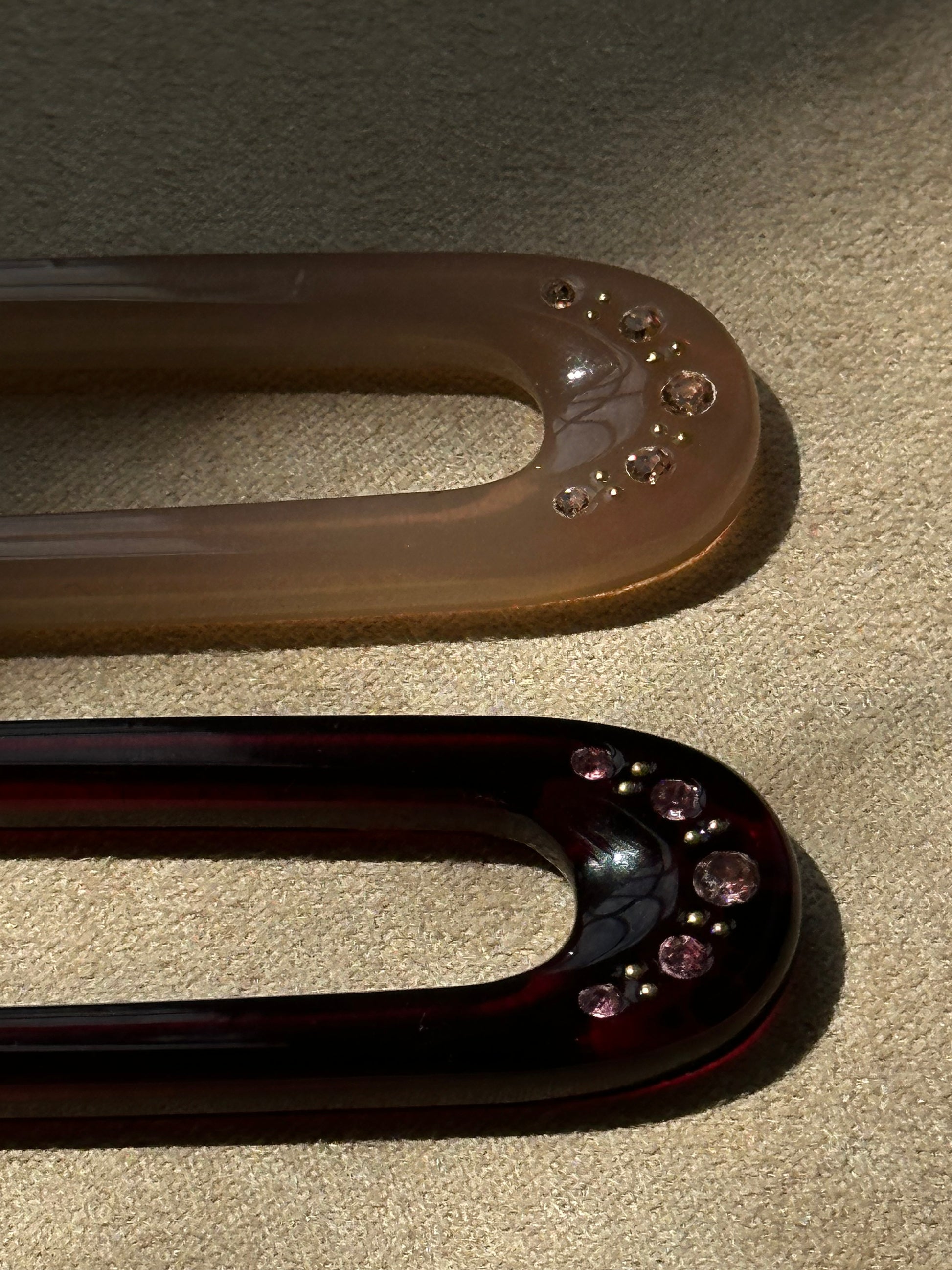 Acetate is best known as the material used for spectacle frames because it is super strong, flexible and hypoallergenic. These benefits make acetate the perfect material to use in the manufacture of our hair accessories. Acetate is a more expensive material than plastic (acrylic), but it is in turn Eco-friendly and has an unsurpassed durability.